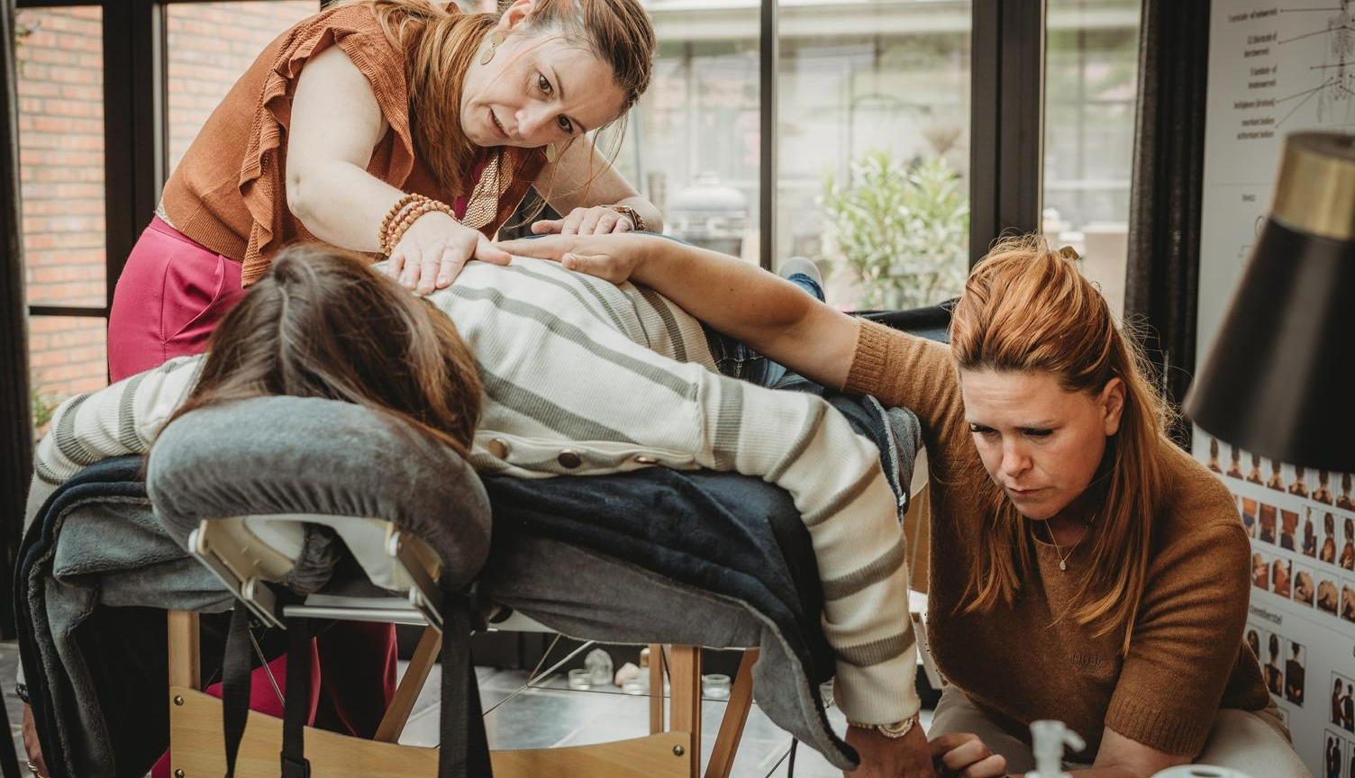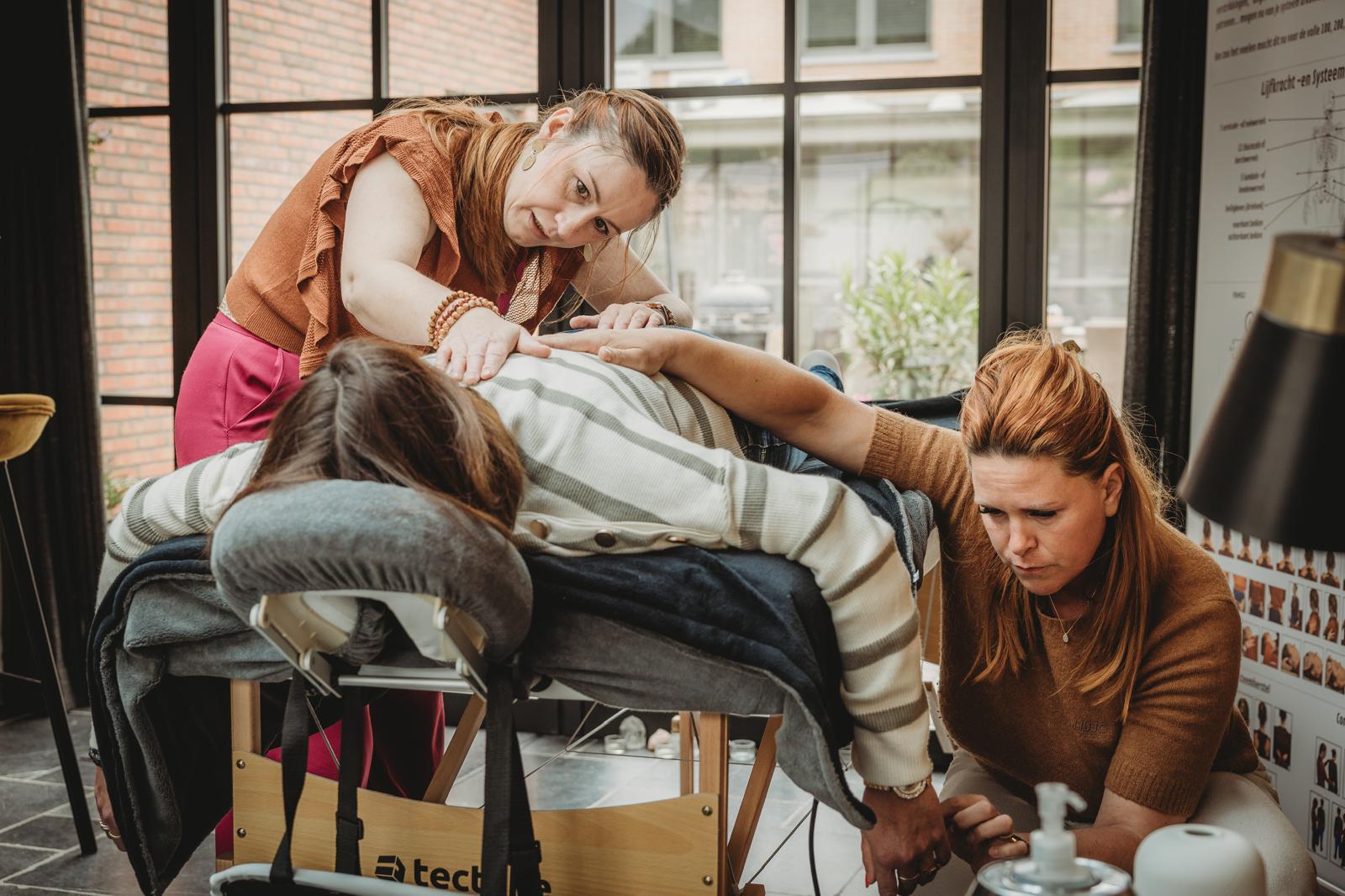 Werkt tegelijkertijd met de andere deelnemers op balanspunten, ademruimte creëren, intuïtieve TTC en energetische ontspanning.
