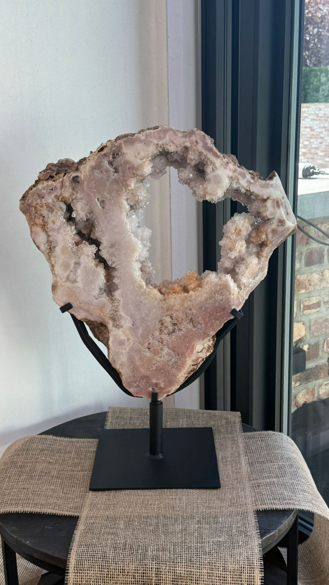 Deze Roze Amethist stond al vaker in mijn gezichtsveld. Ik zag hem staan in de winkel, een prachtig, imposant stuk, maar ik besloot niet te forceren. Als Manifesting Generator leer ik steeds dieper te vertrouwen op mijn strategie: reageren. Ik zette een krachtige intentie neer: "Als jij bij mij hoort, dan kom je naar me toe. Dan neemt niemand anders je mee." Ik liet de controle los. Toen ik later de winkel weer binnenstapte, was de energie verschoven. De steen stond niet meer bovenaan; hij stond op de toonbank. Heel dichtbij. Hij was letterlijk naar me toe gekomen. Op dat moment vroeg ik aan mijn sacrale centrum: "Wat zeg je hiervan?" Het antwoord was een resonerende, fysieke JA. De afstemming was compleet.