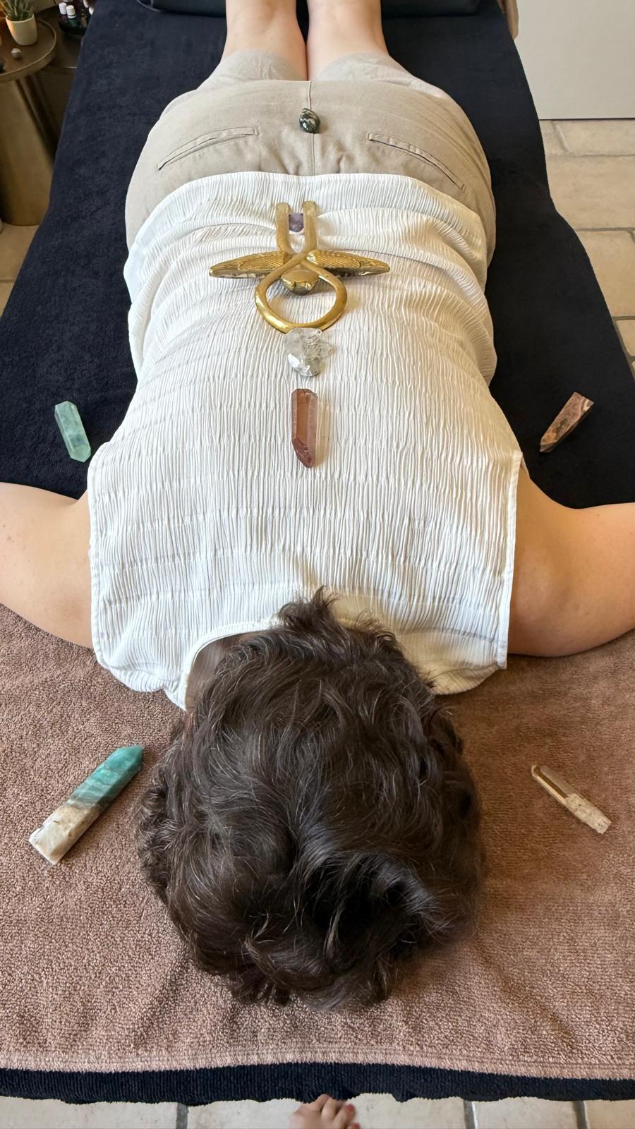 Helende Frequenties: Je ligt continu in diepe ontspanning met koptelefoons (333 Hz), kristallen en sound healing, waardoor loslaten moeiteloos en zonder herbeleven gebeurt.